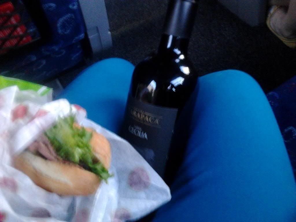Bussissa oli vielä upea hetki ruuan ja juoman kanssa, matkaeväänä Lauralla oli häränlihapatonki ja Chileläistä punaviiniä.
